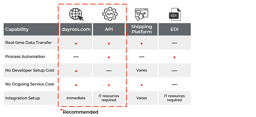 EDI is an electronic interchange method that uses a standardized format and works through a connection to a secure FTP (File Transfer Protocol). EDI becomes easily outdated, it requires an initial developer set-up cost and ongoing service costs to ensure FTP compatibility between you and Day & Ross. Data transmission times are much longer compared to other solutions.